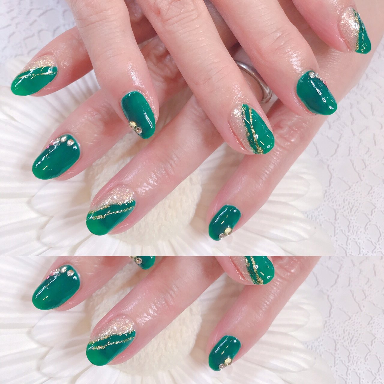 オールシーズン ハンド 変形フレンチ ミディアム グリーン Karen1971のネイルデザイン No 3917129 ネイルブック
